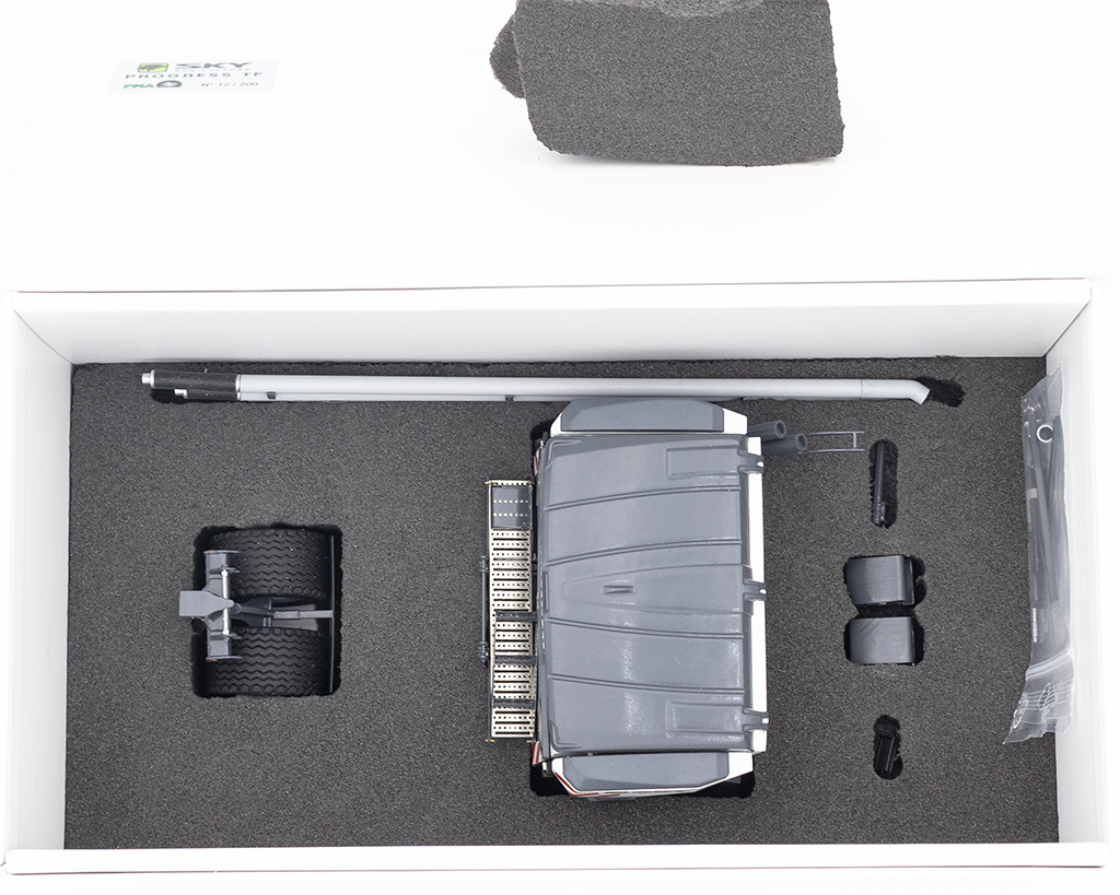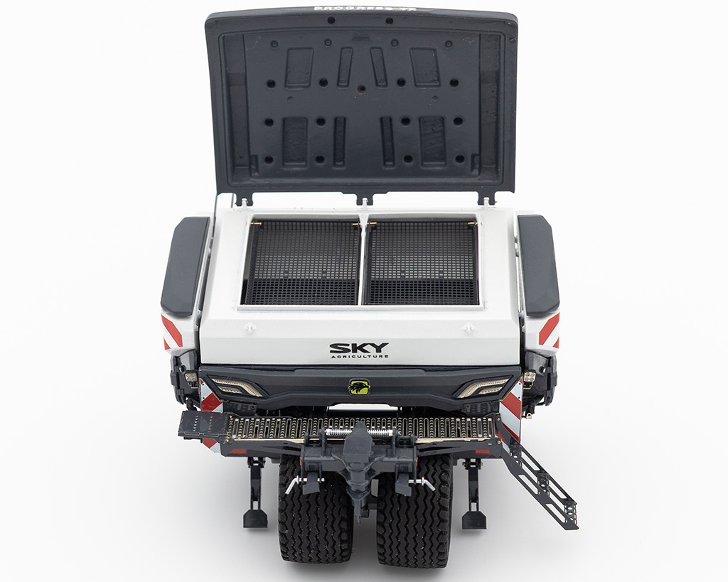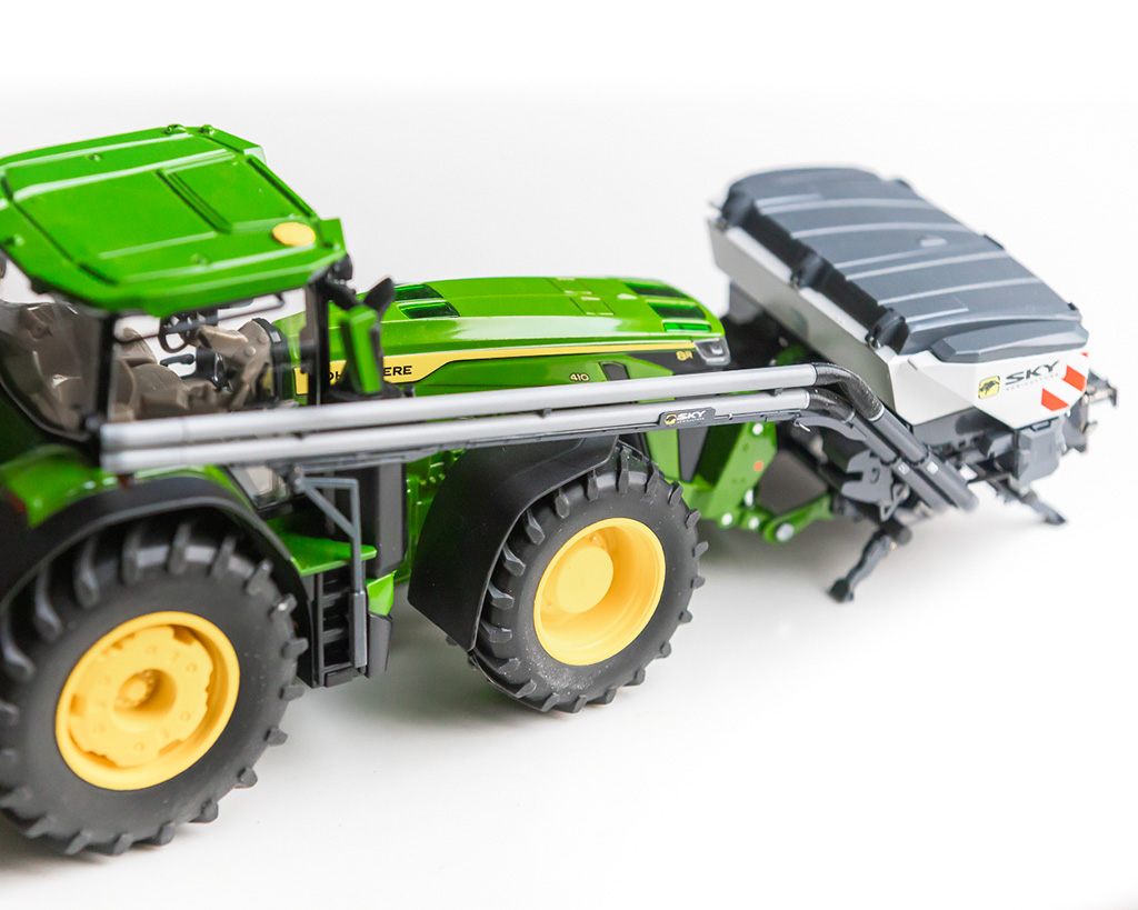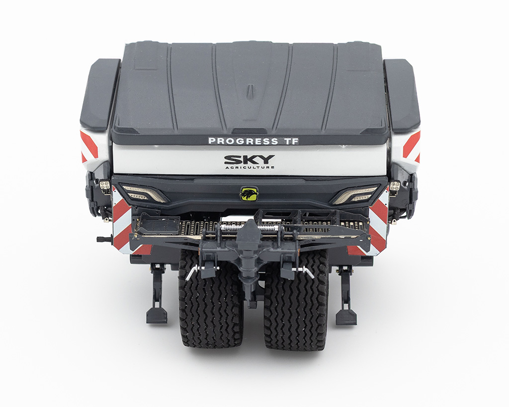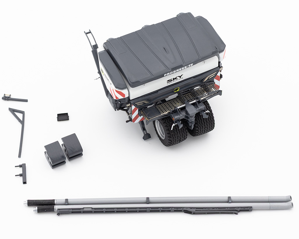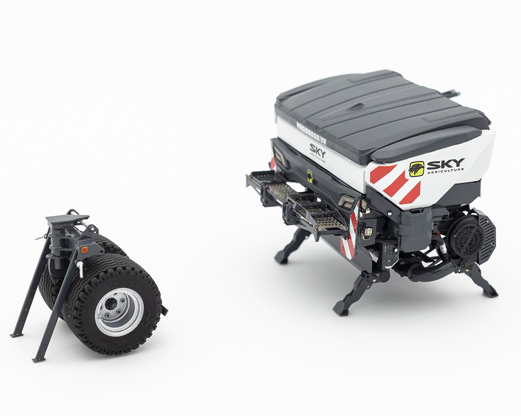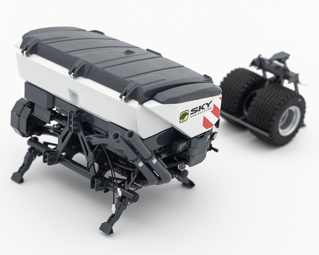 Série limitée à 200 exemplaires à l’échelle 1/32ème. Le constructeur Sky a déjà distribué les 120 premiers modèles fin 2025 (80 modèles restant pour la vente). Modèle détaillé avec ses circuits de distributions, une trémie principale compartimentée en 2 et 2 trémies latérales. Les accessoires (tuyaux latéraux avec supports, masses et consoles) sont présents. Le tasse avant est attelable et livré avec ses béquilles. Le capot principal est fonctionnel et permet d’accéder aux tamis.